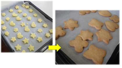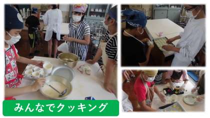 今日はお楽しみ会ということで,お楽しみクッキングに取り組みました。班ごとに作るメニューを分担し,クッキーを作ったりプリンを作ったりしました。型抜きを使ったり,思い思いの形を作ったりながらクッキー作りを楽しみました。オーブンで焼ける様子を見ていると,じわじわ色が変化し焼きあがりの楽しみが増してきました。大きなお鍋に入れて蒸して作ったプリンも,うまくでき上がりました。