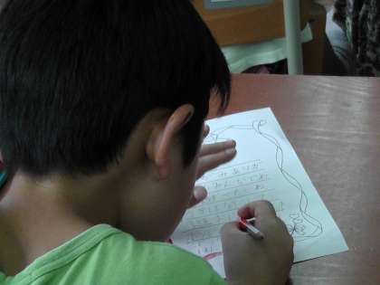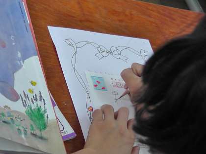 国語科の学習では,暑中見舞いはがきを使って,はがきで手紙を送るときの書き方を勉強しました。また,転校した友だちからのお手紙を読むと,みんな大喜びでした。お手紙の返事を書こうということになり,それぞれの思いを込めて書いていました。