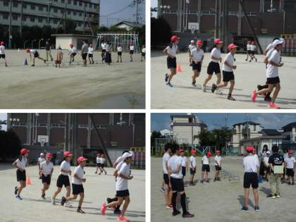 この涼しい時間帯を利用して部活動の陸上の練習を行いました。たくさんの児童が参加して,体操や基本の練習,インターバル練習等に取り組みました。水分をこまめにとって熱中症対策にも気を付けていました。