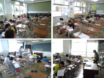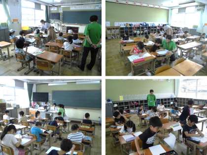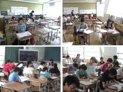 それぞれのクラスで主に夏休みの課題に取り組みます。時間は1時間と短いですが,その分集中して行います。教員も,普段は学習を見ることのできないいろんな学年の教室に入って学習を応援します。この機会にいろんな先生方から勉強を教わったりお話をしたりするとよいですね。