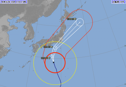 大型で非常に強い台風第19号は,日本の南を北北西へ進み,次第に進路を北東に変えて,非常に強い勢力を保ったまま,12日昼過ぎから夕方にかけて,京都府に最も接近する見込みです。