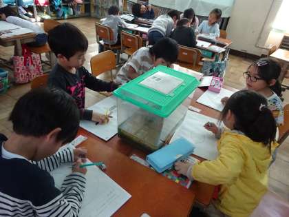 1年生は国語科で,学校にいる生き物の「とっておきのひみつ」をおうちの人に紹介するために学習を進めています。