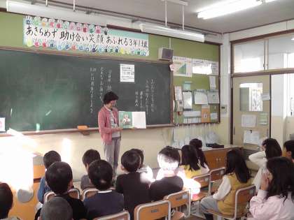 今朝は,地域の図書ボランティアの方による読み聞かせでした。子どもたちは,自分たちで用意をし始め,楽しく読み聞かせを聞いていました。「大きくなったら きみはなんになる」という題名の本でした。大きくなったら,どんな仕事につきたいか思いをもちながら聞いていました。