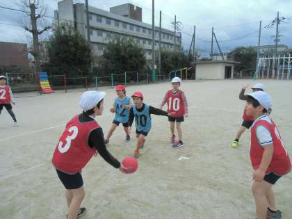 体育科で,「パスゲーム」の学習が始まりました。同じチームのメンバーにボールを投げてパスをします。シュートが成功したら1点です。