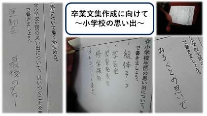 国語の学習では,いよいよ卒業文集作成に向けての取組が始まりました。「小学校の思い出」というテーマをもって,自分のこれまでの学校生活をふりかえりながら書き進めていきます。修学旅行・組体操・最後のタワー・フレンドリー遠足・学習発表会・学芸会など…ふりかえりながら様々な思い出の場面が頭の中に思い浮かんだことだと思います。先輩たちが思いを込めて作った過去の卒業アルバムを見ながら,31人の思い出の詰まった,世界に一つだけのアルバムをすてきなものに仕上げていってほしいと思います。