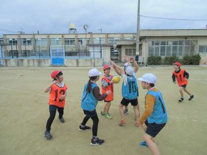 「攻め方や守り方を工夫して,ゲームを楽しもう」というめあてが達成できるように,どのチームも自分達で作戦を考え,練習に励んでいます。作戦どおりにパスをつなぎ,シュートが成功した時には,子どもたちの歓声が運動場に響いていました。