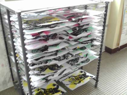 そして今日は,今まで作ってきた紙版画を刷りました。「きれいに印刷して仕上げたい!」というめあてをもち,友だちと協力して進めることができました。自分の作ってきた版画が印刷されると,とても嬉しそうでした。版画のローラーやインクを出す際に使ったいれものも,きれいに洗って後片付けにも意欲的でした。