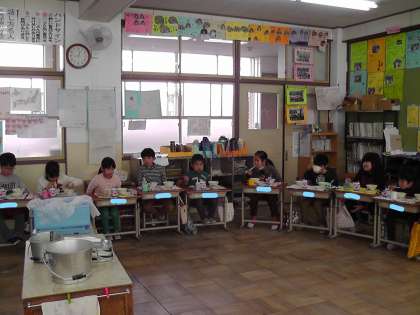 今日は,給食調理員さんと一緒に給食を食べました。子どもたちは今日の交流給食をとても楽しみにしていました。みんなで円になって食べ,ひとりずつ名前と好きな給食のメニューを伝えて自己紹介をしました。子どもたちの好きなメニュー,一番多かったのはカレーライスでした。今日も3年生の子どもたちは,元気に楽しくおいしく給食をいただきました。調理員さんと交流することのできた素敵な会となりました。
