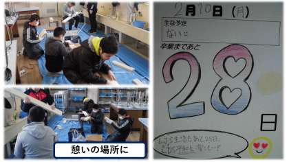放課後の教室には,数名の6年生が卒業制作に取り組んでいました。教室の後ろには,残すは組み立てと仕上げのところまでの彩豊かな作品が並んでいます。作品展では,一人一人思いのある作品が並びます。楽しみです。