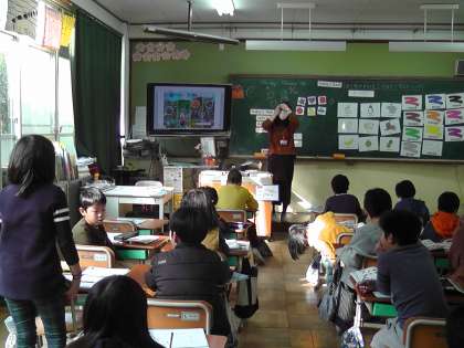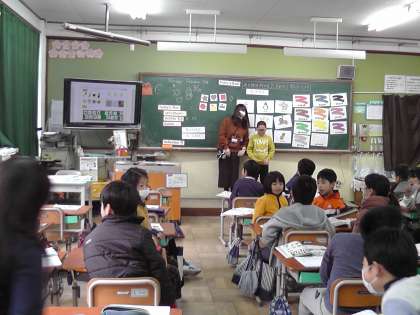 今週の外国語活動でも,「What's this?」や「It's a 〜.」の表現を使ってクイズを出したり答えたりする学習をしました。お休み明けの1校時でしたが,子どもたちは,大変元気に活動していました。黒板の前に立った友だちにクイズを出す問題では,色や形をもとに3つのヒントをみんなで考えて出しました。次の外国語活動も楽しみです。