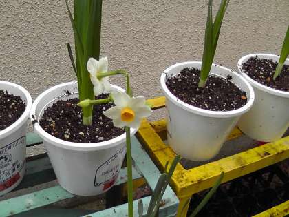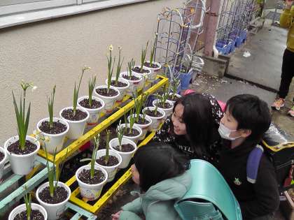3年生は10月頃より人権の花運動の取組として,スイセンの花を育てています。10月に植えた球根に毎日,水をあげたり声をかけたりしてきました。毎日,大切に育ててきたスイセンの花がついに咲きました。子どもたちは,大喜びで,とても嬉しそうです。スイセンの花を育てているとともに,友だちに嫌なことを言ったりしたりしないよう心がけたり友だちと仲良く過ごせるように心がけたりしています。これからも引き続き,大切に育てていきます。