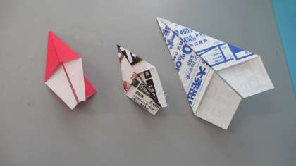 右の写真は,先生が思いついた「ものづくり,自由研究」です。みんなが知っている「紙ひこうき」です。普通に折り紙で折るよりも,少し硬い紙(新聞広告)で折る方がよく飛ぶのかな?と考えて折ってみました。また,大きなものを作ると遠くまで飛ぶのかなと考えて折ってみました。結果はどうなるのか,自分で試してみてください。