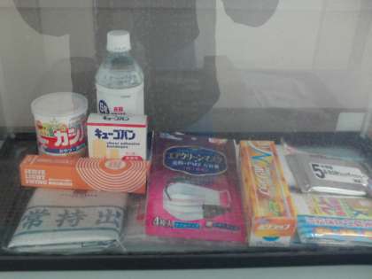 非常時に備えた非常用持ち出し袋。学校にも見本があります。みなさんは,どこにあるか知っていますね。これは,保健室前の廊下に置いてあります。安全ノートを使った安全学習でも習いますね。緊急時に備え,非常食や水など備えておくと良いですね。