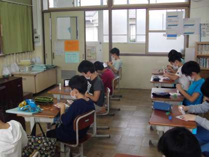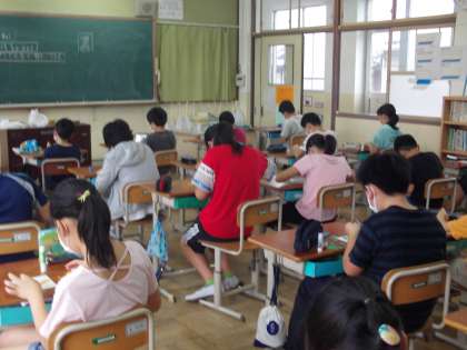 休校前の4月はじめに,どんなクラスにしたいか,どんなことを頑張りたいか考えました。「人の気持ちが分かること」「元気」「考えること」「低学年の見本になること」など,さまざまな意見が出ました。そして,子どもたちから出た意見をもとに学級目標を決めました。クラスをつくるのは自分たち。学級目標もみんなで作りました。ひとり一文字ずつ担当し,色画用紙を細かく切ったものを文字に合わせて貼っていきます。さすが,5年生という姿で,上手に作っていました。学級目標を掲示するのが楽しみです。