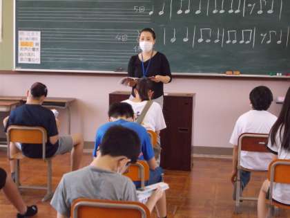 本日6月16日(火)より,音楽科の授業が始まりました。今年度は,田坂先生と一緒に学習を進めてきます。今日の授業では,手拍子のアンサンブルを行いました。学級を二つに分けて,それぞれのパートごとに手拍子をしました。途中で,拍がバラバラに感じたのですが,回数を進めていくうちに,最後はぴったりと合うことができました。