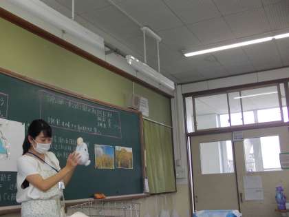 今日の給食の時間には食の学習がありました。栄養教諭の先生に今回は,お米・ご飯のことについて教えていただきました。クイズが入っていたり,お米の人形が出てきたり,子どもたちは,とても楽しそうでした。高学年になって給食のご飯の量が増えたという話もあり,また,給食への関心が高まった様子でした。