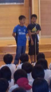 2日目の朝のつどいは,代表の子供が仁和小学校,安井小学校の前でしっかり発表できました。