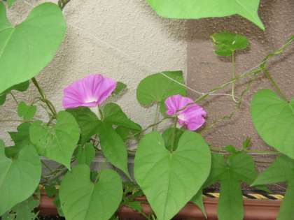 7月12日(火)連日の厳しい暑さにも負けずに, アサガオが日に日につるを伸ばしています。先週あたりから1階の窓を覆うように広がってきました。今朝は, ピンク色のかわいい花を咲かせていました。