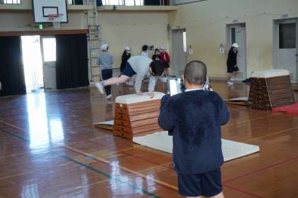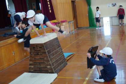 体育科の学習とび箱運動では,バディ学習をしています。タブレットや技カードを活用して,互いに高め合っていけるように声を掛け合って学習しています。バディに「教えてもらってできた。」という声がたくさん聞かれました。技カードは技術的なコツが書かれていて大変役に立ちますが,感覚的なことの方が伝わりやすいということもあるようです。色んな技を獲得して,とび箱運動をより楽しめるようになってほしいです。