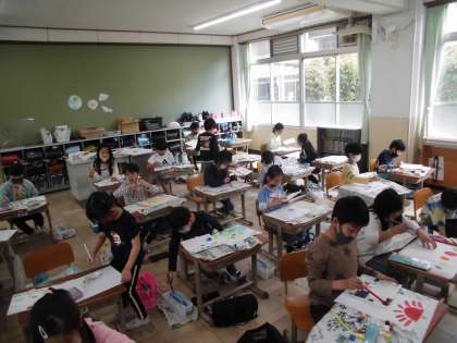 色を混ぜたり,水の量を変えたり,筆の力加減を変えたりして,自由に絵を描きました。描いているうちに「何か」に見えてきます。作品タイトルや思いもつけて,参観日に掲示する予定ですので,楽しみにしておいてください。
