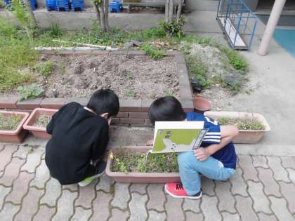 理科の学習で,春の生き物クイズを考えています。3つのヒントで,友達が楽しく見つけられるようにクイズを考えます。いろいろな春が見つかりました。