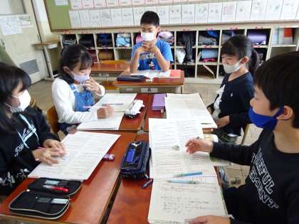 4年生は,国語科「白いぼうし」の学習を進めています。今日はお話の中で不思議に思ったことをグループで出し合いました。子どもたちは教科書や自分たちのノートを見ながら,たくさん話し合う様子が見られました。