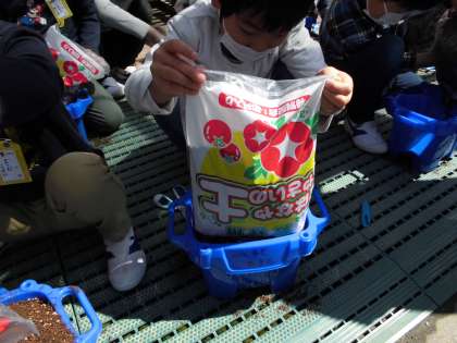 生活科「さかせたいなわたしのはな」の学習で,自分の植木鉢に土を入れました。これから朝顔を育てるための大切な準備です。子どもたちは一生懸命に取り組んでいました。