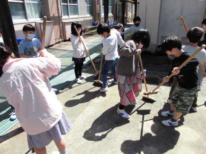 土入れの後,ほうきやちりとりで土を集めてきれいにする姿が見られました。周りを見て気づく力が身付いていますね。