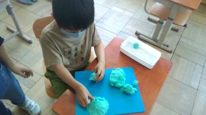 子どもたちは粘土をさわりながら友達と交流をします。「これ何に見える?」の友だちの声に「お茶碗に見えるけど…」「ぼくはチューリップに見える」と反応する子どもたち。質問をした子は「わたしはね,クラゲに見えた」と意見を返していました。子どもたちの想像力には驚かされました。