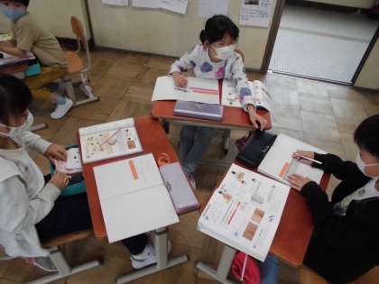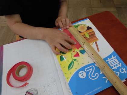 紙テープを切って,10cmぴったりを目指そう!と紙テープを渡しましたが,ノートからはみ出たり,短すぎたり…10cmは思ったより短かったというふりかえりが多かったです。日常的に何cmぐらいかな,といろいろなものを見て,量感を身につけていけたらいいなと思います。