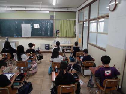 毛筆で大きな字を丁寧に書くと,「とめ・はね・はらい」などがはっきり分かり,硬筆での力の入れ方も身につきます。子ども達と,毛筆の学習の大切さについて話し合い,授業の流れを確認しました。