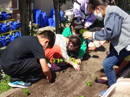 「大きくなってほしい。」「どれくらいツルが伸びていくかな。」とこれからの生長を楽しみにしている様子でした。今後もみんなでお世話を続けていく中でたくさんの発見をしていきたいですね。