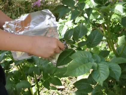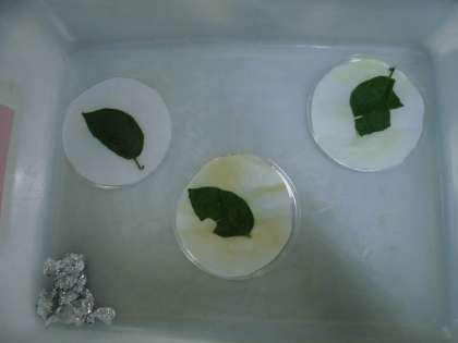 ジャガイモの葉を,アは「前日からアルミニウム箔をかぶせて一晩おき,朝には葉にデンプンがなくなっていることを確かめる葉」,イは「アの状態から,アルミニウム箔を外して数時間日光に当てる葉」,ウは「アの状態から,アルミニウム箔をかぶせたままにして葉に日光を当てない葉」として,実験しました。