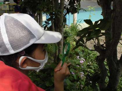 今日の図画工作科では,自然の中にかくれている「ともだち」を見つけに行きました。