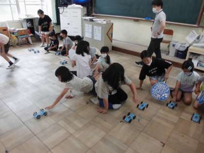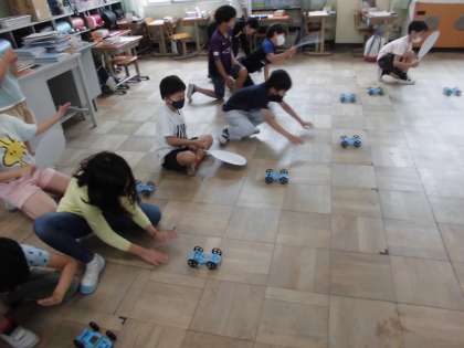 理科の学習で,車とうちわを使って遊び,学習問題をつくりました。「どうすればうちわ1回のあおぎで,車をより進められるのか。」という学習問題に対して,予想を立てました。「風を受けるものがあればいい。」「風の力を強くすればいい。」車を軽くすればいい。」など,いろいろな意見が出ていました。