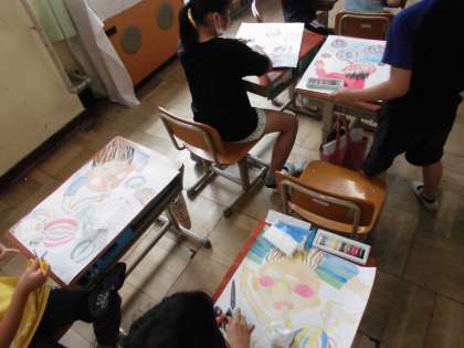 肌の色や髪の毛,服などを丁寧に彩色し,本日,背景をコンテパステルで仕上げました。いろいろな構図,色合いの作品ができました。