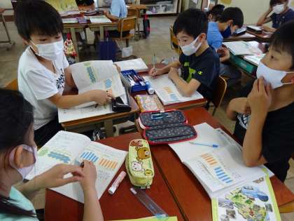今日の学習では,友だちと協力してグラフを見ながら,気づいたことをまとめていきました。「国語で学んだアップとルーズが使えるね。」とグラフを読むときに,これまでの学習を生かしている様子も見られ,大変すばらしかったです。