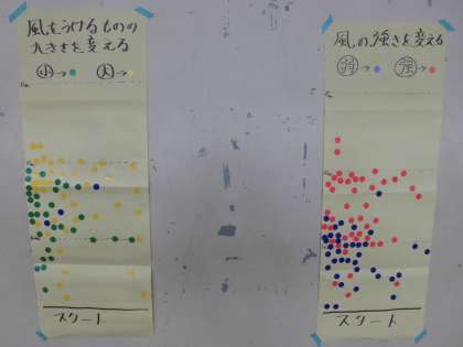 体育館にて,風の強さを変えて,実験しました。くり返し実験し,全体で共有した結果,「風の力が強くなると,車の進む距離は長くなる。」という結果になりました。