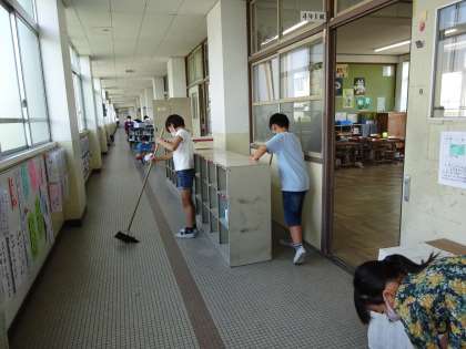 教室や廊下,階段などそれぞれの担当場所で,みんなが力いっぱい頑張る姿に大変心が温まりました。子どもたちのおかげで,たくさんの場所がきれいになって,気持ちよく夏休みが迎えられます。よくがんばりました!