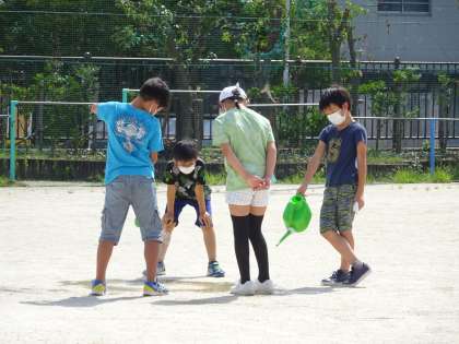 今年の夏はたくさん雨が降りましたね。運動場も一面が大きな水たまりのようになっていましたが,今日のようないいお天気の日には水たまりはありません。雨は一体どこへ行ったのだろう・・・?ということで,今日はジョウロを使って水を流し,雨がどうなっていくのか予想を立てました。