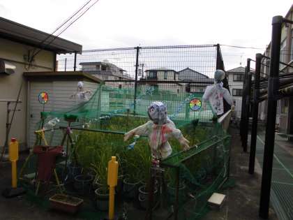 再来週,稲刈りをする予定です。かかしと子どもたちの目が光っています。お米がたくさん獲れますように。