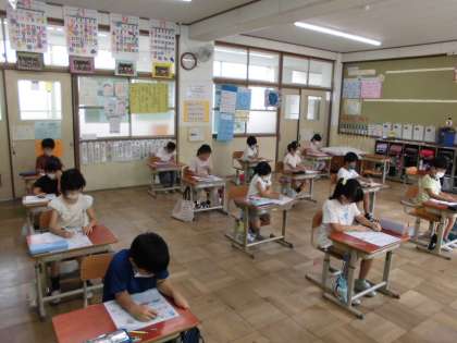 テスト問題に集中して取り組む子どもたち。宿題や朝学習などでも,復習をしていこうと思っています。