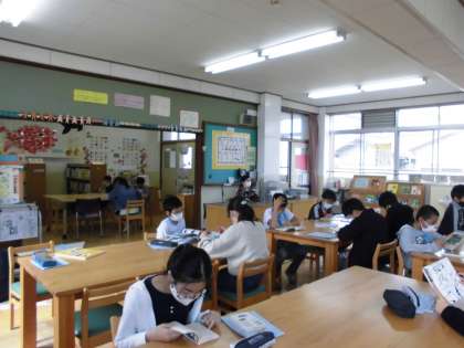 6年生の国語科の授業で,図書館を利用しています。国語科の学習に沿って本の貸し借りを行ったり,社会科で歴史を学習する前や後に気になった時代を確認したりしています。