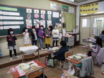 旬の食べ物を知ることができた1年生は,早速給食の献立を見て旬の野菜を探していました。