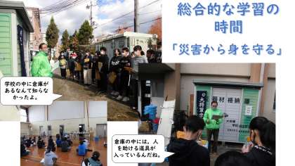 「災害から身を守る」の学習で,自主防災会の生谷さんより自主防災会の倉庫にある物品を並べて活動を紹介してもらいました。実際に難所運営に活用する段ボールベットやパーテーションなどを組立てていただき,座ったり,寝たりする活動を行いました。また,教頭先生より実際に避難所になったときに使う防災グッズについて説明していただきました。