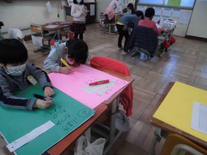 今日は,「おもちゃランド」に招待してくれた2年生を“「1年生花丸パーティー」に招待する作戦”をみんなで考え,それぞれの担当に分かれて準備しました。