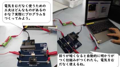 理科「私たちの生活と電気」の学習で,身の回りには,明るさセンサーなどを使って,エネルギーを効率よく利用している道具について理解し,実際に目的に合わせてセンサーを使い,モーターの動きや発光ダイオードの点灯を制御するなどといったプログラミングを体験しました。また,実際にプログラムを組むことで,その仕組みを体験的に学習しました。