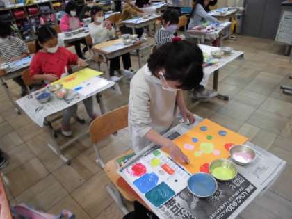 今日の図画工作科では,とろとろ絵の具の感触を味わいながら,思いついたものを楽しく表していました。