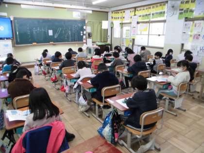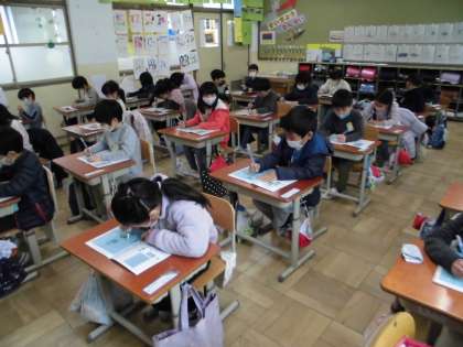 書写の学習で水書をしました。いつも使う鉛筆ではなく,筆を使って線なぞりをしたり,自分の名前を書いたりしました。使う物は違うけれど,筆の持ち方や姿勢はいつもと変わらないことに子ども達は気づいていました。しかし,筆を使うときは力加減に気をつけなければならないので少し難しそうでした。色々なことに気づくことができた1時間でした。