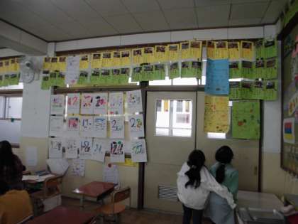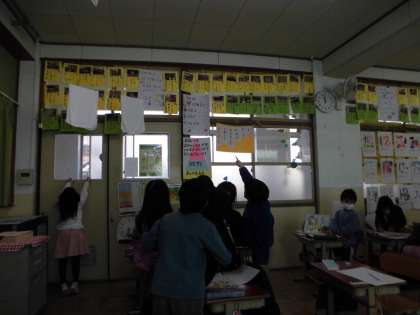 1年間の思い出を振り返りながら,特に心に残ったことを絵と文でまとめて,紹介します。そのために,教室の側面に貼られた「1年生のいいこと見つけカード」や過去のおたよりをみながらどんなことがあったかを書きまとめました。